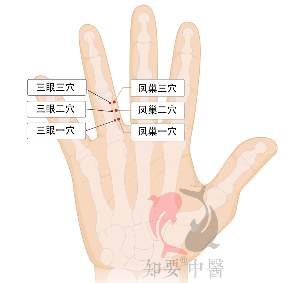 三眼二穴:当掌面无名指第一节正中央点偏外侧三分处是穴。