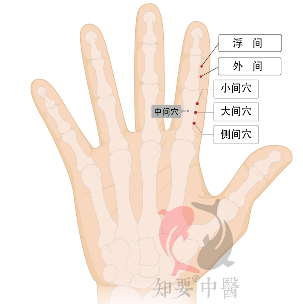取穴:掌面食指第二节中央偏外侧三分下一分半处,即浮间穴下三分处。