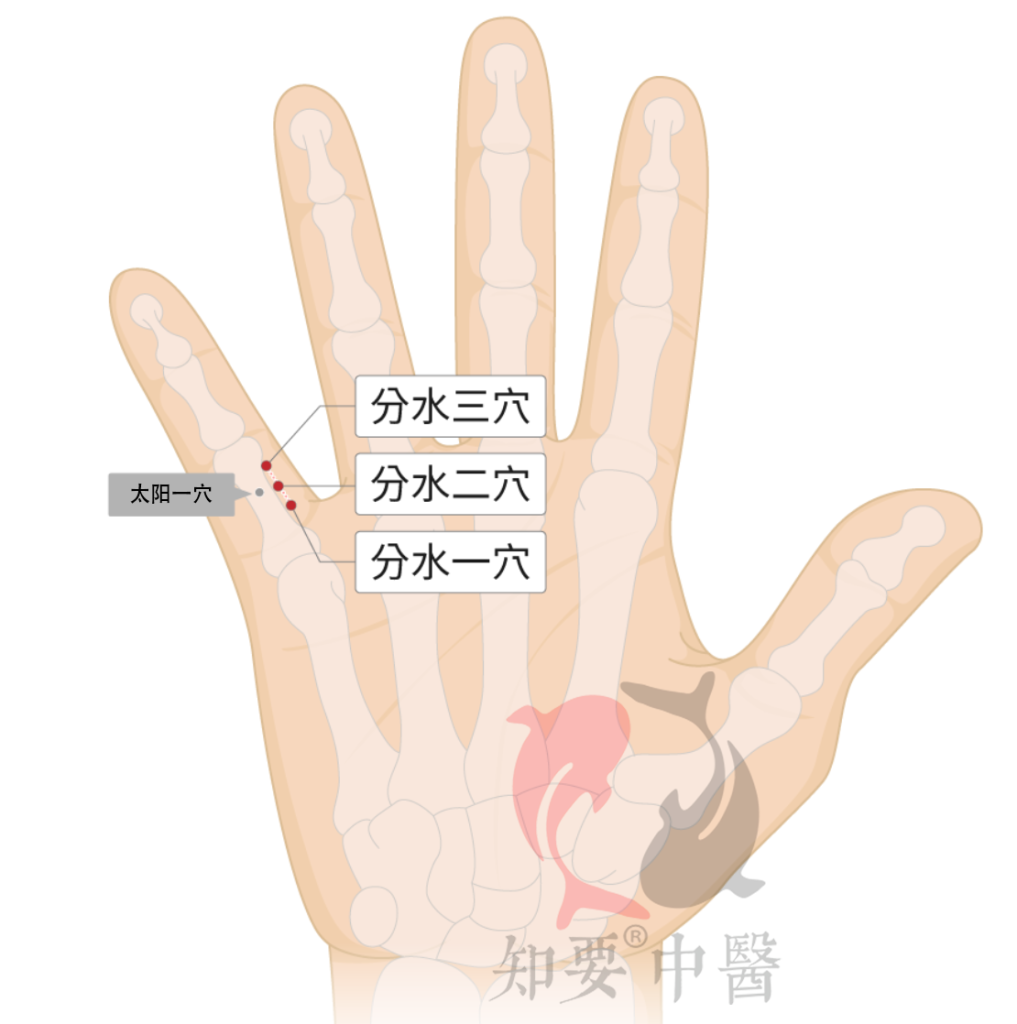 分水二穴:掌心向上,当小指第一节正中央点(即太阳一穴)偏外侧三分处是穴。