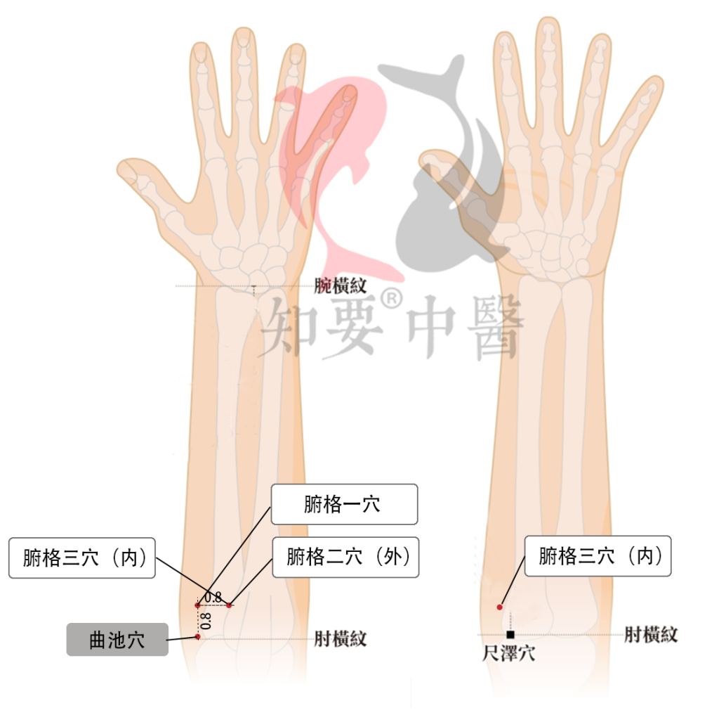 腑格三穴:位于曲池穴下方八分处一穴,向内肺经侧隔八分处为三穴。